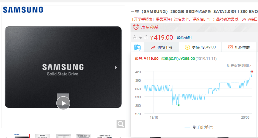 2019 年 11 月,价格低点期间三星入门级的 250GB 固态硬盘大概价格为 299 元,2020 年 3 月已经涨价到了 420 元。同样上涨的,还有内存。