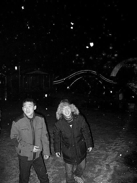大年初一晚上,阿狗与徒弟在玉环公园雪中合影,哈哈。 |