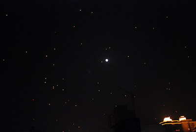 晚上玉环的街道上太热闹了,不停地放烟火,震得人发慌。抬头向外望从玉环公园上空不停地升起孔明灯,景象很是壮观,只是镜头记录不下来,照片中最亮的是月亮,然后旁边一小点一小点的可不是什么星星,那可统统是孔明灯啊,上面全写着:I LOVE YOU! 或者是:心相印…… 。男人们打肿脸充胖子也要买的, 这会儿估计徒弟生意肯定很好,赚爆了。